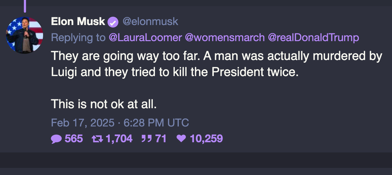 They are going way too far. A man was actually murdered by Luigi and they tried to kill the President twice.